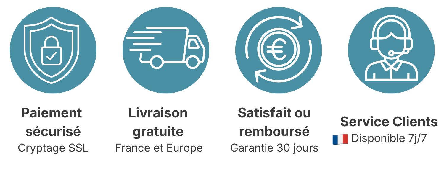 Nous offrons une garantie de satisfaction 30 jours, satisfait ou remboursé. Si nos produits ne répondent pas à vos attentes, vous pouvez nous retourner votre commande dans les 30 jours suivant la réception pour un remboursement.